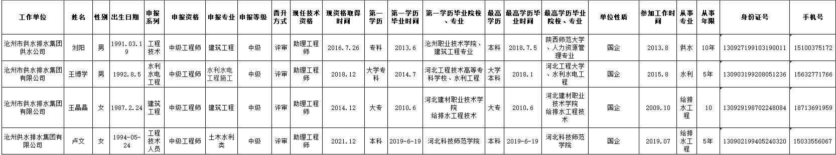 2021年供排水集團申報中級職稱人員登記表